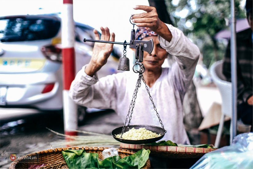 Cô bán cốm cân từng lạng nhanh thoăn thoắt cho khách
